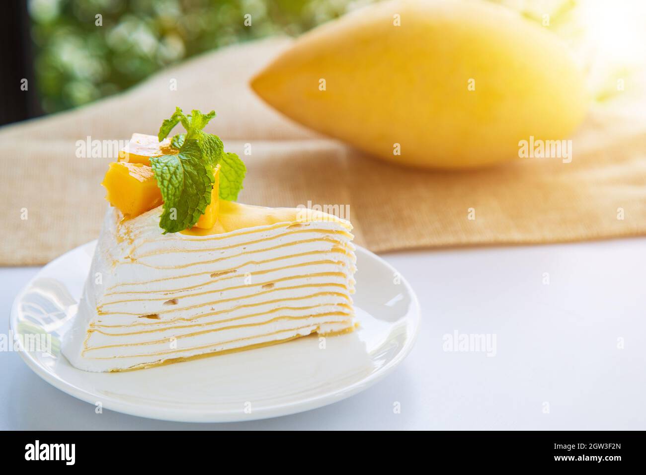 Mango Crepe Cake In White Dish With Peppermint And Whip Cream Topping On White Tabl Stock Photo Alamy